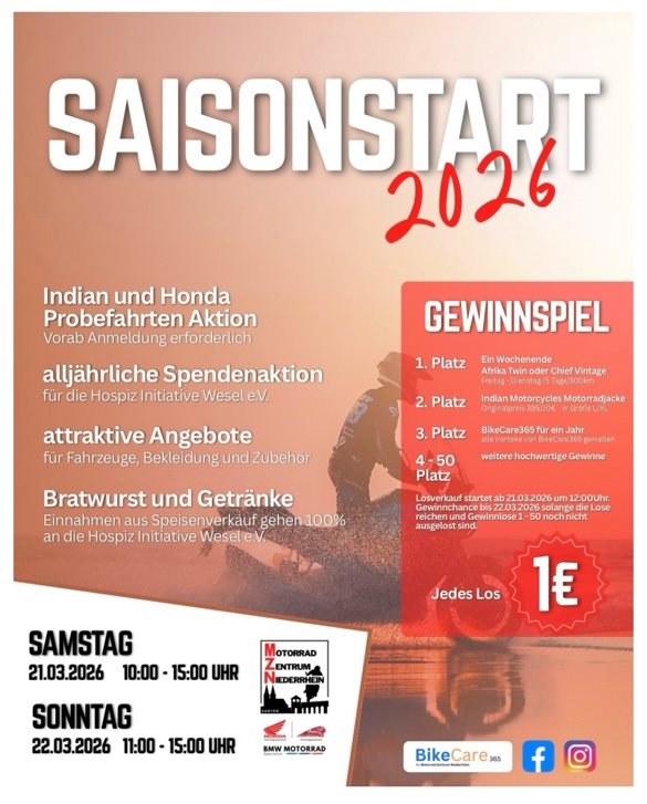 Hallo liebe Kunden, Interessenten, Motorradfahrer und Freunde, gerne wollen wir Euch über den diesjährigen Saisonstart am 21. und 22. *März Informieren. Am 21. März sind wir von 10:00 - 15:00 Uhr für Euch da und am Sonntag von 11:00 - 15:00 Uhr. Es werden geführte Probefahrten auf ausgesuchten Honda und Indian Motorrädern angeboten, hier empfiehlt es sich einen Termin vorab zu reservieren, da die Erfahrung zeigt, das an solchen Tagen die Slots schnell ausgebucht sind. Gerne könnt ihr per Mail oder telefonisch vorab schon einen Termin klar machen. Weiter wird es an dem Tag besonders Interessante Eröffnungsangebote geben, sowohl im Fahrzeug als auch im Bekleidungsbereich. Weiter ist für das leibliche Wohl wie immer gesorgt und auch in diesem Jahr werden wir keine Kaufpreise für Getränke und Essen haben, sondern jeder wird wieder Spenden dürfen für das Kinder Hospiz in Wesel. Wir freuen uns auf Euch bei hoffentlich gutem Wetter. Euer Team vom MZN